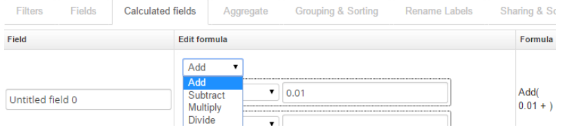 4. Replace the Untitled field 0 with the name of the new field. In the Edit formula column first choose the operator: Add/Subtract/Multiply/Divide/Add Date/Subtract Date/If.