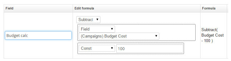 For example, to have the Budget cost reduced by 100 USD for every Campaign choose Subtract, then choose Field and select Budget cost. Select Constant in the next line and input 100. The formula will be displayed in the last column. The example will look like: