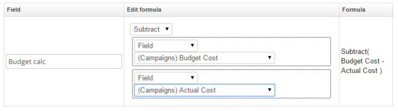 To continue the example, to subtract the Actual cost from the Budget cost, change Constant to Field and then select Actual cost: