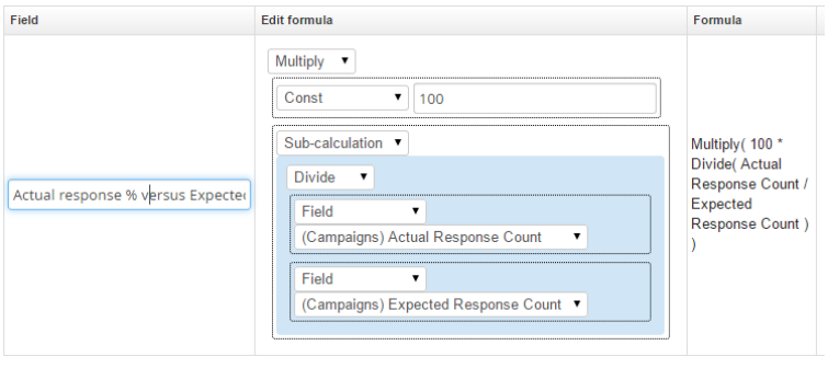 For example, to calculate Campaign Actual Response Percentage (%) from Expected, the formula would need *100 and two field division, so it would look like this: