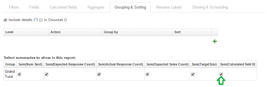 8.Finally identify under Grouping and Sorting if summaries / grand totals of the newly calculated value are needed: