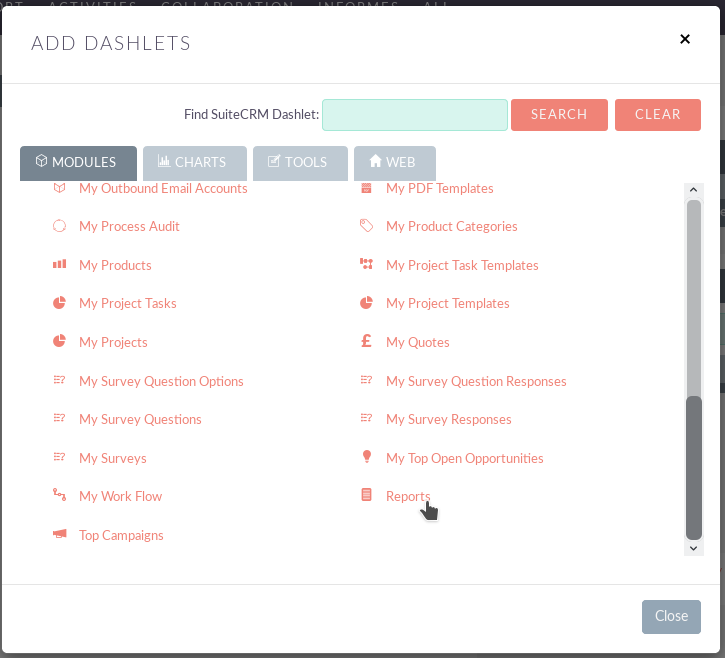 Advanced Open Reports (AOR) are the reporting module within SuiteCRM. You can access AOR by clicking on the Reports link in the navigation menu. The reporting module allows users to report CRM data from any module and has many features to quickly display key information.