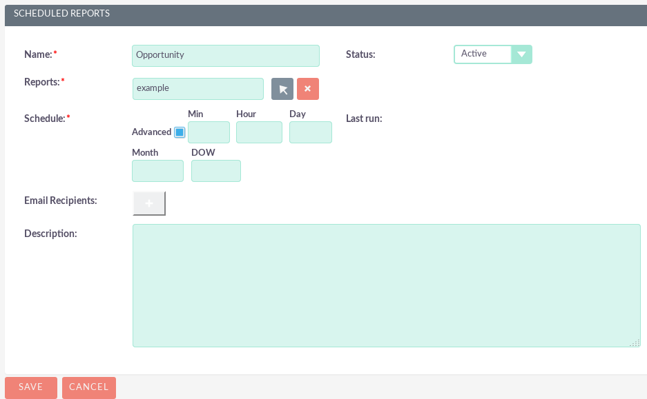 You can schedule reports to run automatically and send them via email to the required contacts. This allows users to schedule reports that are sent to managers or team leaders either daily, weekly or monthly. To create a Scheduled Report, you can click on the Create option in the Scheduled Reports subpanel in the Detailed View of the Report. You can also select existing Scheduled Reports to relate to the Report.