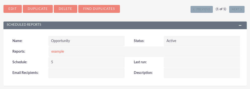 Once you save the scheduled Report record, Scheduled Reports will be displayed in the Detailed View of the Report in the secondary panel.