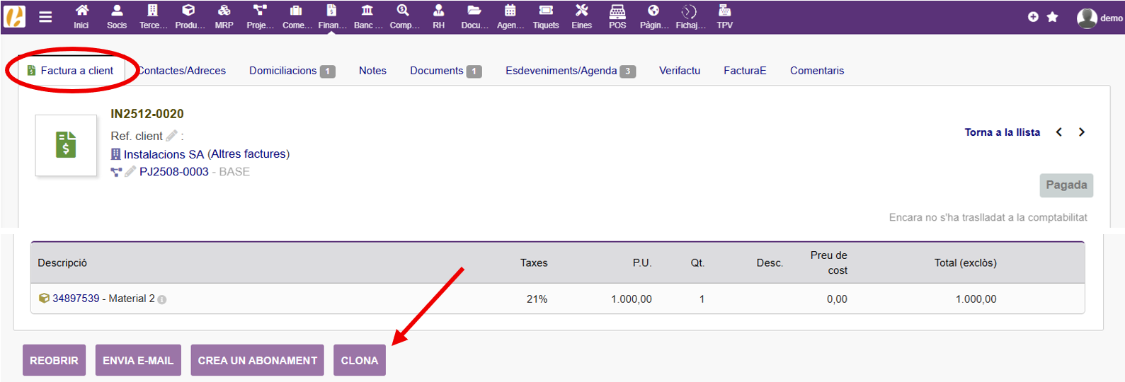Al abrir la factura que deseamos clonar, nos dirigiremos a la parte inferior de la pestaña “Factura (a cliente o de proveedor)” y pulsaremos el botón CLONA.