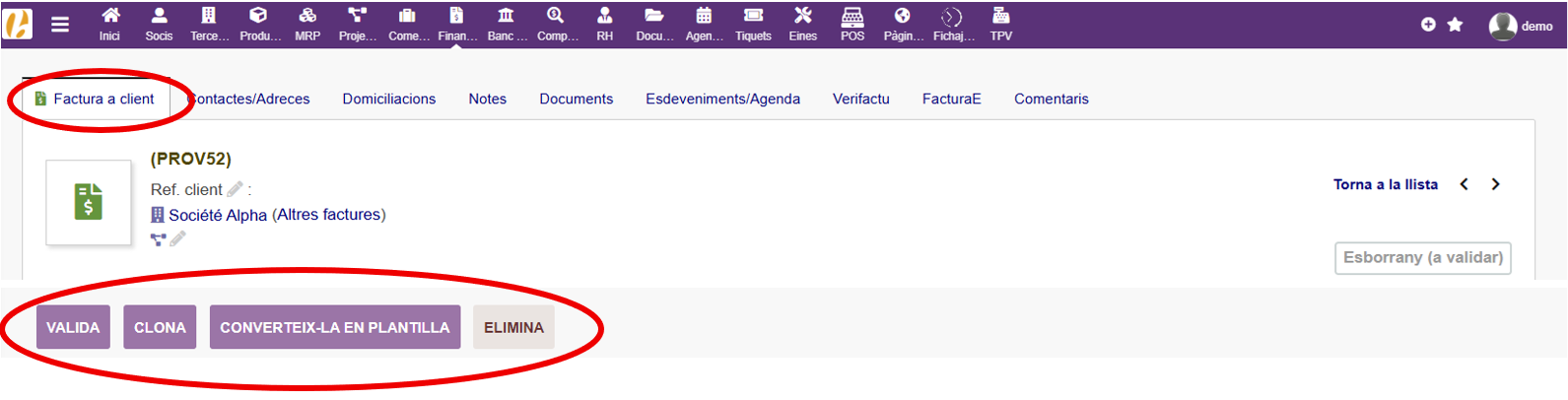 Al aceptar, se genera un borrador de factura en el que podremos modificar los datos si es necesario. Una vez tengamos toda la información introducida, podremos Validar para generar la factura, convertirla en plantilla, clonar el borrador o eliminarlo.