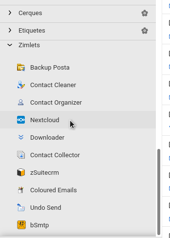 2. Un cop tenim el Zimlet de Nextcloud implementat en el nostre Zimbra, per poder configurar-lo, ens dirigirem a la pantalla principal de Correu, al menú lateral esquerra, en l’apartat Zimlets, situat en la part inferior.