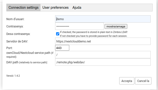 5. Introduirem al camp Servidor DAV: l’enllaç del nostre WebDAV fins al domini (.net, .com …), en l’exemple: ”https://nextclouddemo.net”. En DAV ruta: la part d’enllaç que segueix, fins webdav, en aquest cas: ”/remote.php/webdav”. Finalment, en Ubicació ownCloud/Nextcloud: la part d’enllaç que segueix, en aquest cas: ”/”