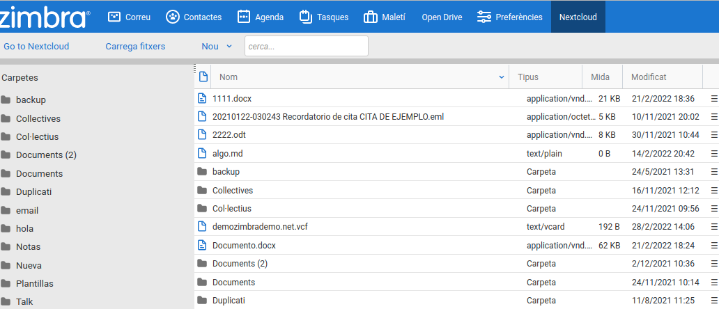 6. Finalment, podrem dirigir-nos a la nova pestanya situada al costat de Preferències, per gestionar el nostre Nextcloud des de Zimbra: