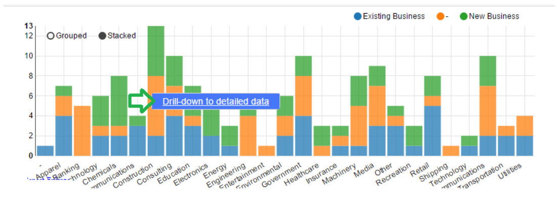 Drill down is not available for users who have no permission to drill-down the data. It is also not available for customized combined reports, Geographic Chart and Gauge Chart.