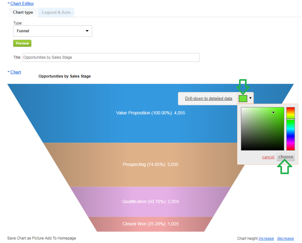 In order to change the chart area colors, you should open the report containing your chart. Click any chart area to change its color and select the color from the color-picker located next to the Drill-down. Remember to save the report in order to update the chart with the new colors.