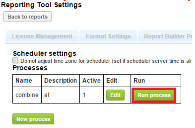 3. Run the process (it will create a new table via union that combines calls, meetings and tasks). This process should be executed regularly to update the table with current data. It can be scheduled from the sugar scheduler by selecting Analytic Reporting Processes.