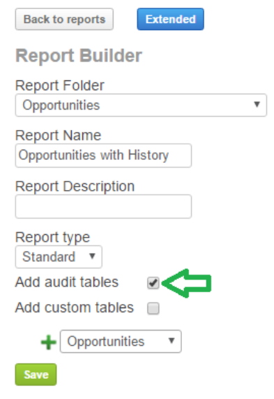 Select the necessary module and simply mark the Add audit tables check-box. Save and open the new report.