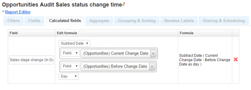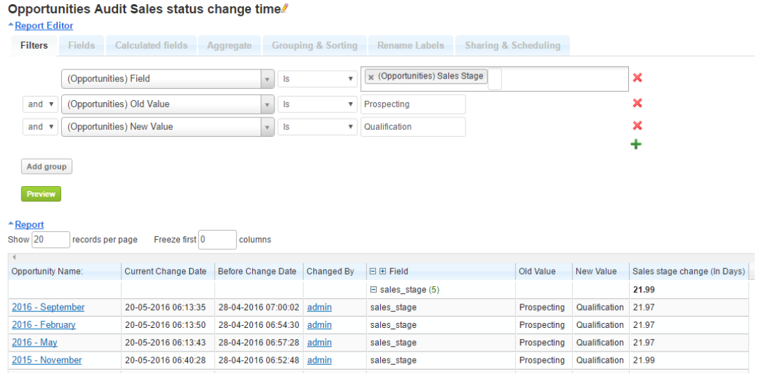Now you can select the necessary fields from the audit table as well. If we want to calculate the time it took from the old value being changed to the new value, you can use Calculated fields, Subtract Date function as in the example below: