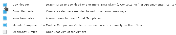 2. Once here we will find a list of Zimlets available (the Zimlets that we find will depend on our Zimbra server). In addition to the name, each Zimlet includes a small description that will help us understand its function. To activate it, it will only be necessary to mark the square located on the right side of the name of the Zimlet that we want to add.