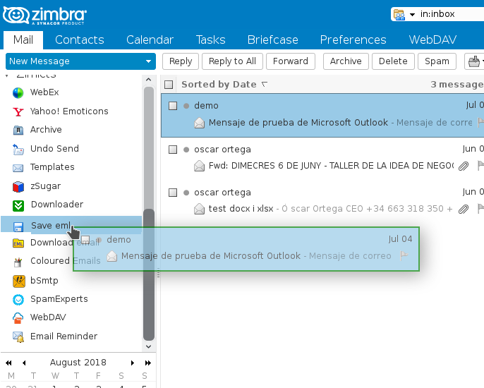 1. To download messages, we will use the Zimlet Save eml. If we do not have this Zimlet implemented, we will consult the manual How to implement Zimlets to our Zimbra?. Once implemented, we will drag the mail we want to download to the Zimlet Save eml located in the left side menu.