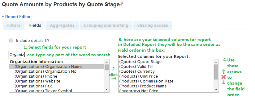 4. If you have selected Include details check-box, then you will see all field data in your report. The column order in a detailed report will be organized same way as the fields in the right-side box. Highlight a field and then use the up/down arrows to change the field order.