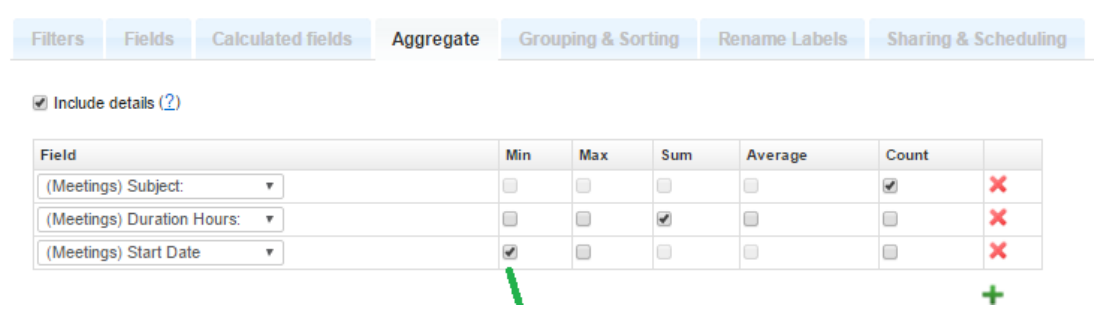 Under the Aggregates tab you can select which fields you would like to Count, Summarize, or find Minimal, Maximal or Average value. Simply select the field from the drop-down menu and then mark the check-box next to the selected field. Click the green “+” to add additional fields for aggregating. Remove fields with the red X.