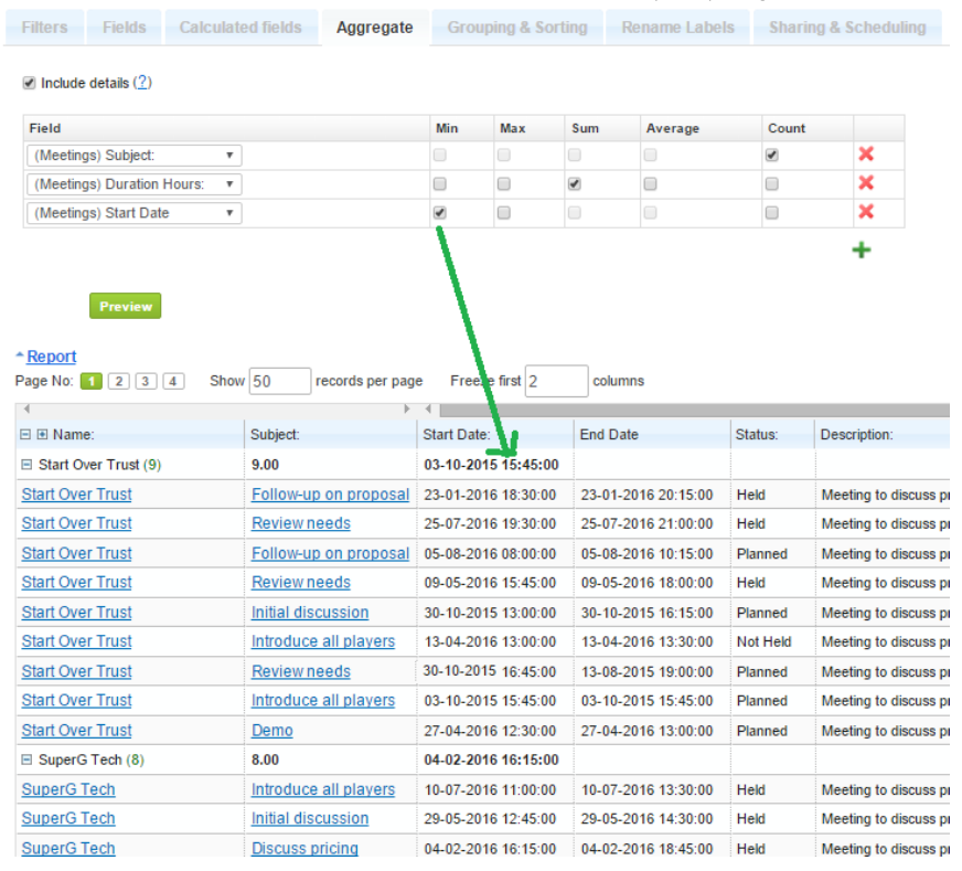 Min / max values you can calculate for amounts and for date/date-time field types. As always, it is necessary to select at least one Group by item under Grouping & Sorting. For example, if you need to see the first meeting date and time for each of your Customers, please select Min value for meeting Start Date under Aggregates and Account Name to be grouped by under Grouping & sorting tab.