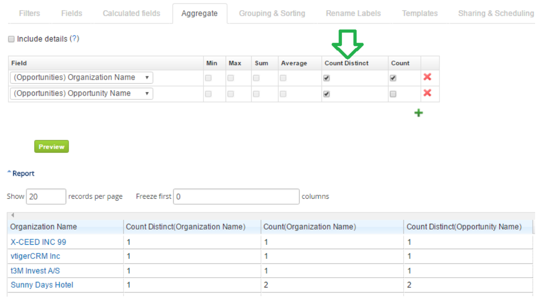 For example, you create report of Organizations with Opportunities, where 5 Organizations are related to 10 Opportunities in Total. If you need to count, how many Organizations are there, you should select Count Distinct – for Organization Name; it will return correct number: 5. If you select just Count for Organization Name instead, it will return number 10 (no matter, if you choose Count for Account Name or Opportunity, since Count returns total count of all records).