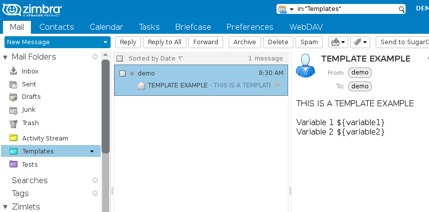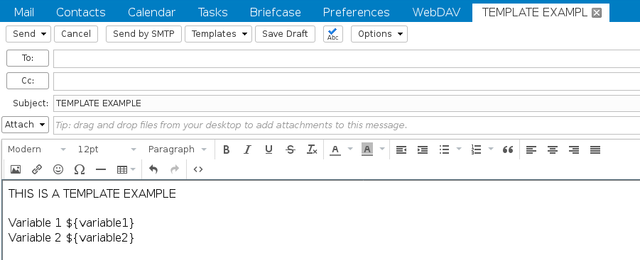 6. Once we have the e-mail template in the Templates folder, we can already use them. To do this, we will compose a new e-mail, addressing, as previously, the Templates drop-down. In it we will find the previously created template (if it does not appear we will press Reload Templates). We can also choose if we want to insert the variables body only; body and subject; body, subject and participants (provided that we have previously established them in the template).
