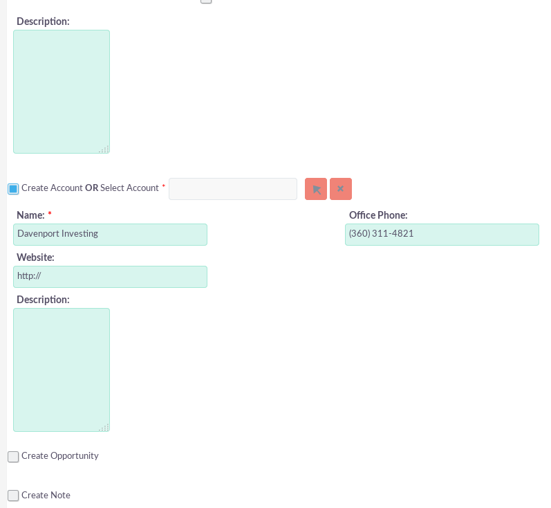 By deselecting the check-box next to “Create Contact“, you can associate the Lead with an existing Contact. However, in most cases when converting a Lead there will not be an existing Contact. Make sure that the Create Contact check box is selected. Some of the fields will be automatically filled in with the Lead information. Complete the remaining relevant fields and proceed to the next stage below: