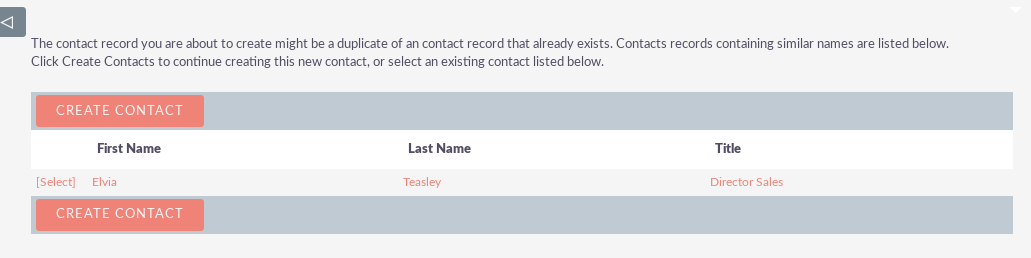 If you find that the duplicate warning is not valid and you still want to create a new record, click the Create button. Otherwise, if you decide that the warning is correct and the record already exists in CRM, you must click the Select button.