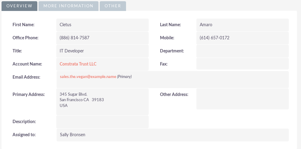 The details view is tabulated in SuiteCRM. This means that there is a minimum displacement and the data is categorized for each module in the corresponding tab.