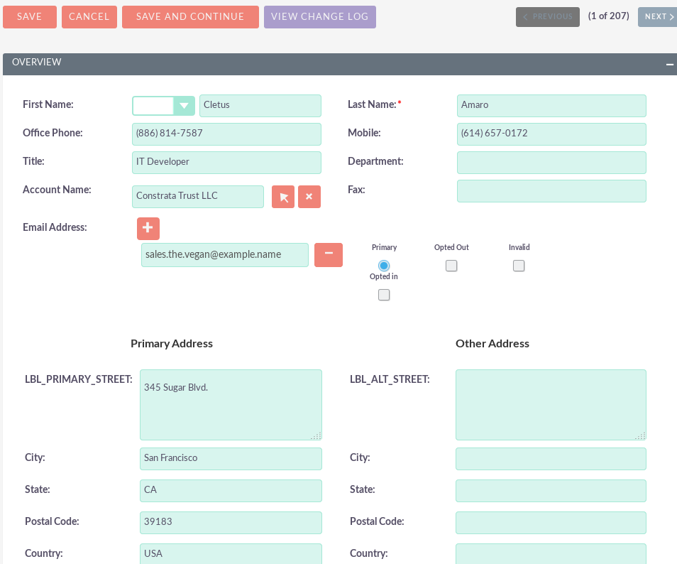 The edit view allows you to modify the registration information that is displayed in the view. This allows users to update existing data and also add / delete data. Once you have made the changes in the edit view, you can click “Save” to apply the changes or click “Cancel“. When you click on any of the options, it will redirect you to the details view of the record you are editing. You can click on the ‘View change log‘ button. This allows users to see the changes in the audited fields that may be useful before making the intended changes.