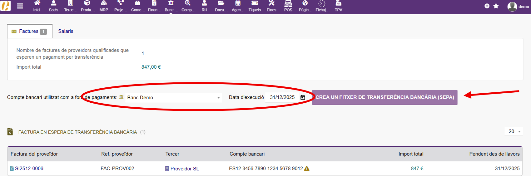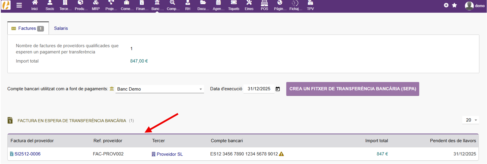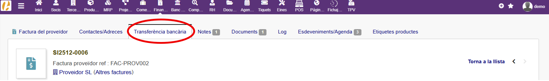 Si tenemos una factura de un proveedor validada, podemos generar la orden de transferencia. Primero tenemos que generar una solicitud de transferencia. Para ello, nos dirigiremos a la pestaña “Transferencia bancaria” en el menú superior de la factura.
