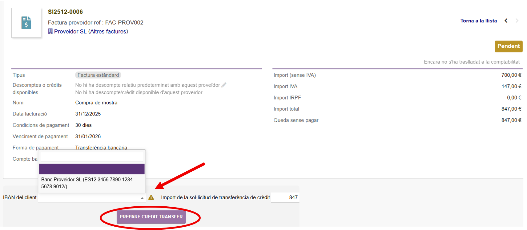 En la parte inferior de la ficha, encontramos una ventana donde seleccionaremos el código IBAN del proveedor. Si todo está correcto pulsaremos el botón “PREPARAR TRANSFERENCIA”.