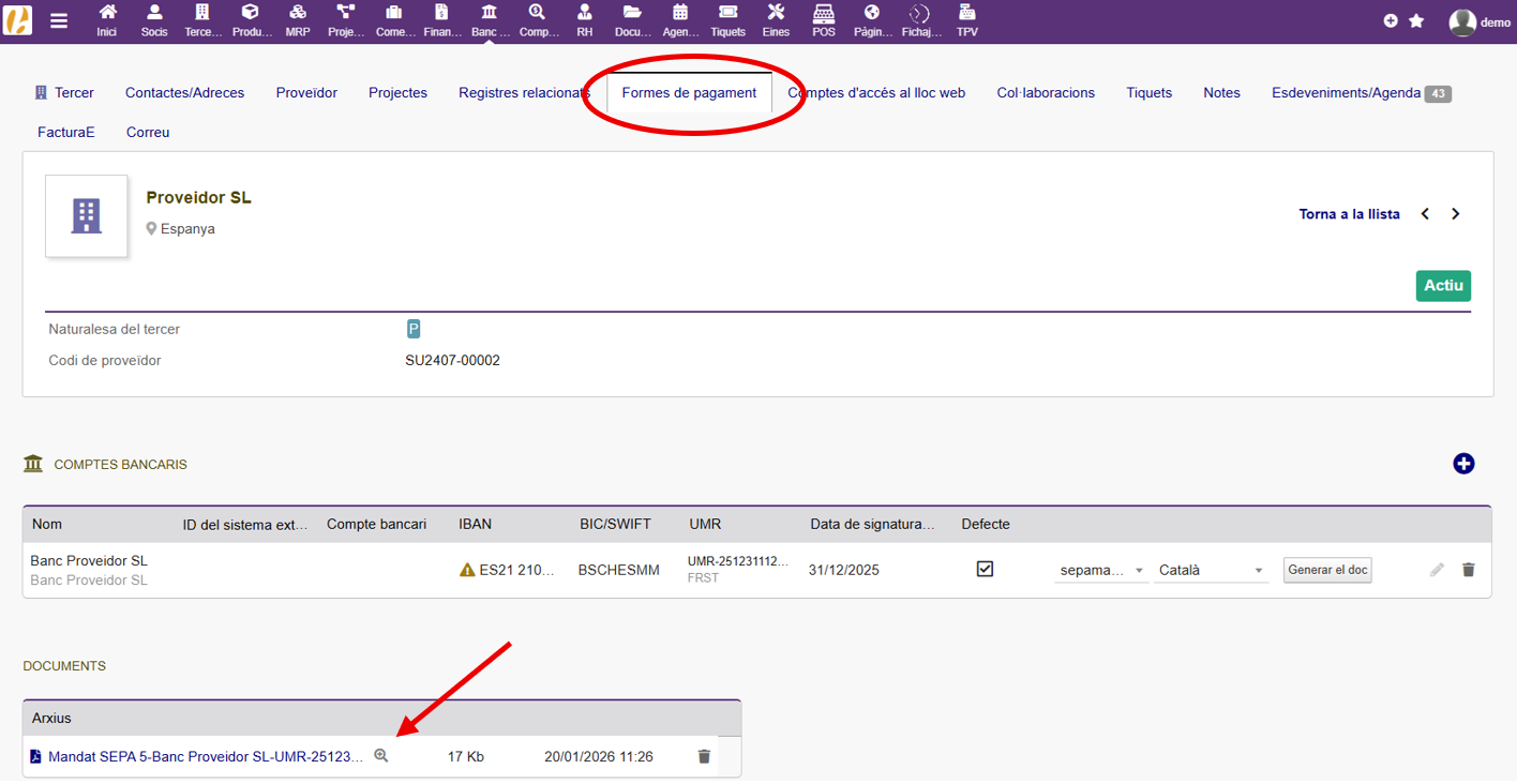Encontraremos la orden SEPA disponible para enviar a nuestro banco en la ficha del proveedor, en la parte inferior de la pantalla, dentro de la sección «Formas de pago» en el menú superior. Si hacemos clic sobre el archivo, este se descargará en nuestro dispositivo. Si pulsamos sobre el símbolo + situado a la derecha del fichero, podremos visualizarlo.